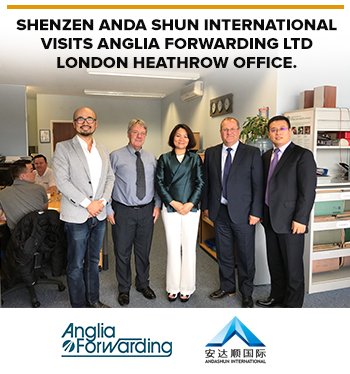 Picture (from left to right): Richard Li (Shenzhen Anda Shun International Logistics Co. Ltd.), Alex Jacob (Anglia Forwarding Ltd), Susan Liu (Shenzhen Anda Shun International Logistics Co. Ltd.), Paul Snookes (Anglia Forwarding Ltd), Gerry Yang Shenzhen Anda Shun International Logistics Co. Ltd.). |